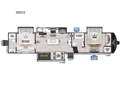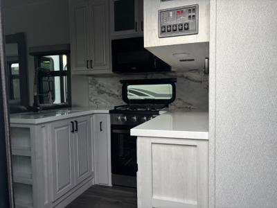 A six-point hydraulic automatic leveling system allows you to set up quickly at camp, and the second adjustable power awning with LED lights is an added layer of protection as you spend time outdoors. Inside, you'll love the solid surface countertops in the bath and kitchen, Slow Rise roller shades, and soft close hardwood cabinet doors and drawers. The Climate Package features Azdel laminated sidewalls, dual attic vents, a high-efficiency triple A/C system, and more features that will help you camp in cold and hot climates.