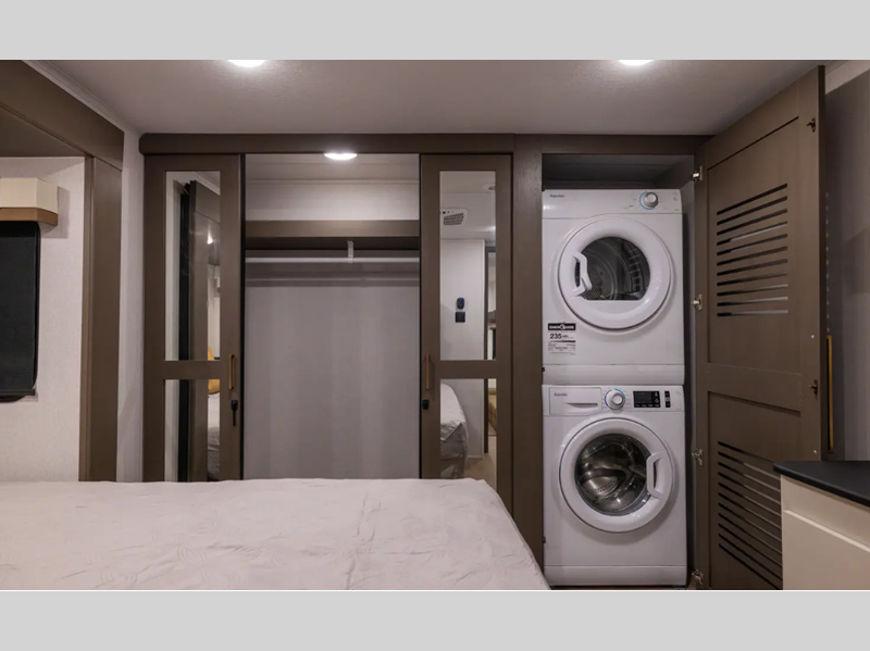Sleeps 6 Slides 4 Length 41 ft 11 in Ext Width 8 ft Ext Height 13 ft 4 in Hitch Weight 2320 lbs Dry Weight 12444 lbs Cargo Capacity 3876 lbs Fresh Water Capacity 64 gals Grey Water Capacity 88 gals Black Water Capacity 44 gals Furnace BTU 35000 btu Available Beds King Refrigerator Type 12V Refrigerator Size 16 cu ft Cooktop Burners 4 Number of Awnings 2 LP Tank Capacity 30 lbs Water Heater Type On Demand Tankless AC BTU 27000 btu TV Info LR 65" TV Awning Info 8' 6" and 16' Power w/LED Lights Axle Count 2 Washer/Dryer Available Yes Number of LP Tanks 2 Shower Type Standard Electrical Service 50 amp Solar Wattage 200 watts Similar Floorplans