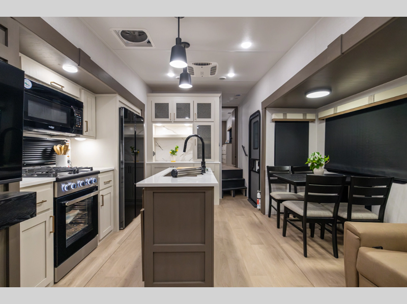 Sleeps 4 Slides 3 Length 40 ft 10 in Ext Width 8 ft Ext Height 13 ft 3 in Hitch Weight 2120 lbs Dry Weight 12619 lbs Cargo Capacity 3501 lbs Fresh Water Capacity 64 gals Grey Water Capacity 108 gals Black Water Capacity 44 gals Furnace BTU 35000 btu Available Beds King Refrigerator Type 12V Refrigerator Size 16 cu ft Cooktop Burners 4 Number of Awnings 2 LP Tank Capacity 30 lbs Water Heater Type On Demand Tankless AC BTU 27000 btu TV Info LR 65" TV Awning Info 14' and 18' Power w/LED Lights Axle Count 2 Washer/Dryer Available Yes Number of LP Tanks 2 Shower Type Standard Electrical Service 50 amp Solar Wattage 200 watts Similar Floorplans
