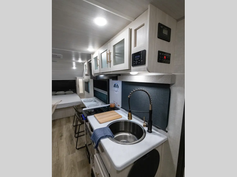 Sleeps 3 Slides 1 Length 20 ft Ext Width 8 ft Ext Height 9 ft 10 in Hitch Weight 385 lbs Dry Weight 2974 lbs Cargo Capacity 1811 lbs Fresh Water Capacity 30 gals Grey Water Capacity 30 gals Black Water Capacity 30 gals Available Beds Queen Refrigerator Type 12V Black Glass Convection Cooking Yes Cooktop Burners 2 Number of Awnings 1 Water Heater Type Tankless AC BTU 15000 btu TV Info 12V TV Awning Info 8' Power Axle Count 1 Shower Type Neo-Angled Electrical Service 30 amp Similar Floorplans