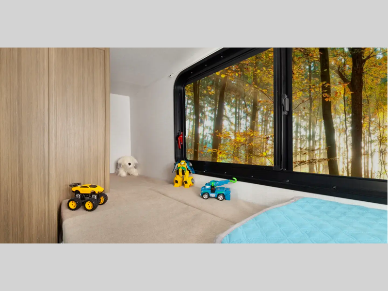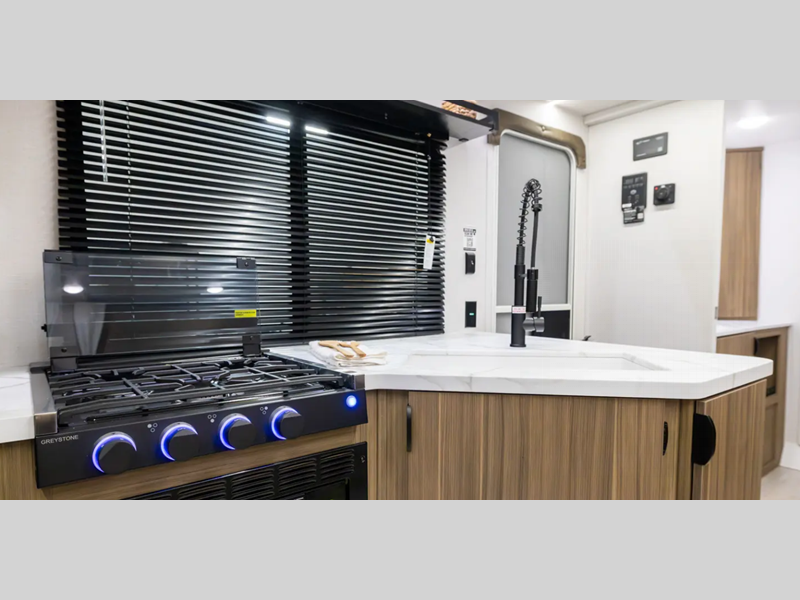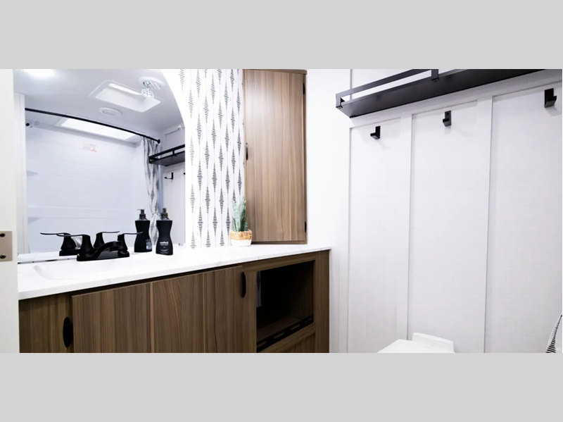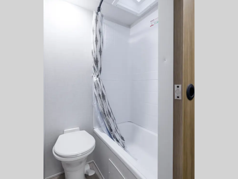 There are stylish window shades inside, along with TFL cabinet doors, upgraded backsplash, plus elegant curtain rods and curtains to make you feel more at home. You will also appreciate some of the best-in-class features such as, an enclosed Accessibelly for added protection, exterior accent lighting, a powder coated I-beam frame, and seamless holding tanks.
