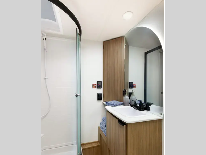 Sleeps 3 Length 22 ft 8 in Ext Width 8 ft Ext Height 10 ft 1 in Hitch Weight 521 lbs Dry Weight 3986 lbs Cargo Capacity 3685 lbs Fresh Water Capacity 40 gals Grey Water Capacity 30 gals Black Water Capacity 30 gals Available Beds Custom King Versa Tilt Number of Awnings 1 Water Heater Type Tankless AC BTU 13500 btu Awning Info 10' with 4K Blade Lighting Axle Count 2 Shower Type Radius Similar Floorplans