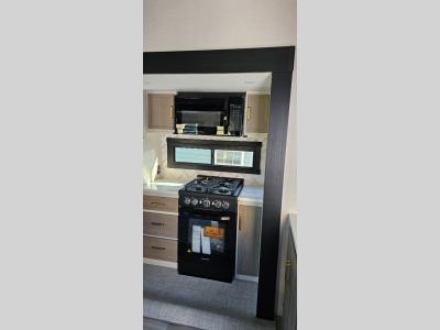 It won't be hard to find comfort in this spacious fifth wheel for four! Once you've unloaded the pass-thru storage, you can head inside to make lunch in the full kitchen. There is a 16-cu. ft. 12V refrigerator here to keep food fresh, and everyone can dine at the kitchen island with four chairs. The theater seating is directly across from the 50" TV and fireplace, and you'll appreciate the hidden storage behind the TV for movies, games, and books! A desk with a chair is also found in the combined kitchen and living area if you need to get some work done, and a rear tri-fold sofa provides sleeping space for guests. Don't overlook the spacious full bath with dual sinks and the front private bedroom with a custom king bed slide. A front wardrobe plus a dresser will let you keep your space tidy, and there is washer/dryer prep if you plan to add those appliances!