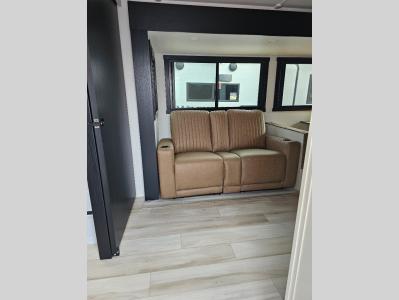 Whether it's a couples night or family night, you can enjoy the spacious living and kitchen area thanks to the large slide out. Grab your favorite snacks from the hidden storage behind the swing-open entertainment center and head to the booth dinette and/or the theater seats with cupholders. You will be able to easily whip up your best meals and clean up even easier with the L-shaped countertop with an extension. The front private bedroom features a queen bed with Versa Tilt to get a good night's rest with wardrobes on either side to keep the room tidy, and the rear bathroom is spacious with a sliding door and two linen closets!