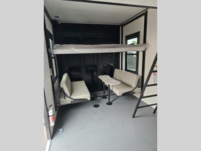 These toy haulers are 3/4 ton or 1 ton towable, and the additional height and width provides extra room for your toys to come along too. The MORryde CRE3000 suspension enhancement makes towing smooth and the Ground Control 3.0 auto electric leveling will have you set up at camp in no-time. The contemporary interior design will make your space feel a little more like home and the Congoleum stain-resistant vinyl flooring is perfect for a toy hauler with dirt, gas, and oil being brought in.