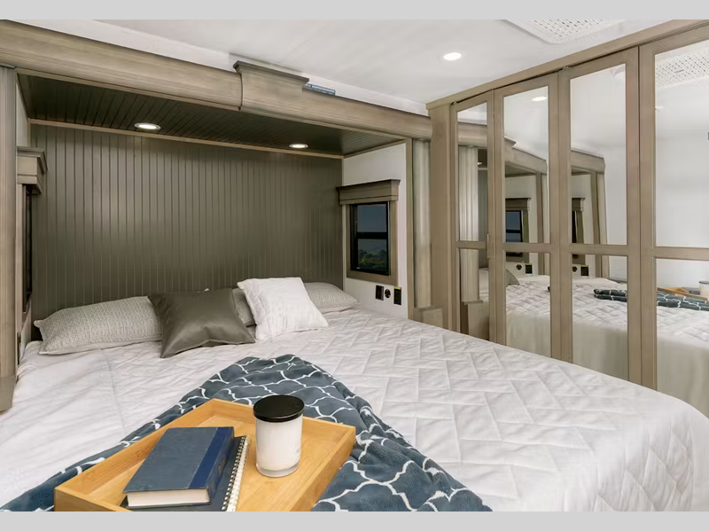 Each model continues to set the benchmark for luxury with thoughtfully designed features like the central vacuum, the JBL entertainment, and the Beauflor vinyl flooring throughout. The hardwood cabinets will stay looking beautiful for years, and the high-performance A/C will keep you cool during those hot summer camping months.