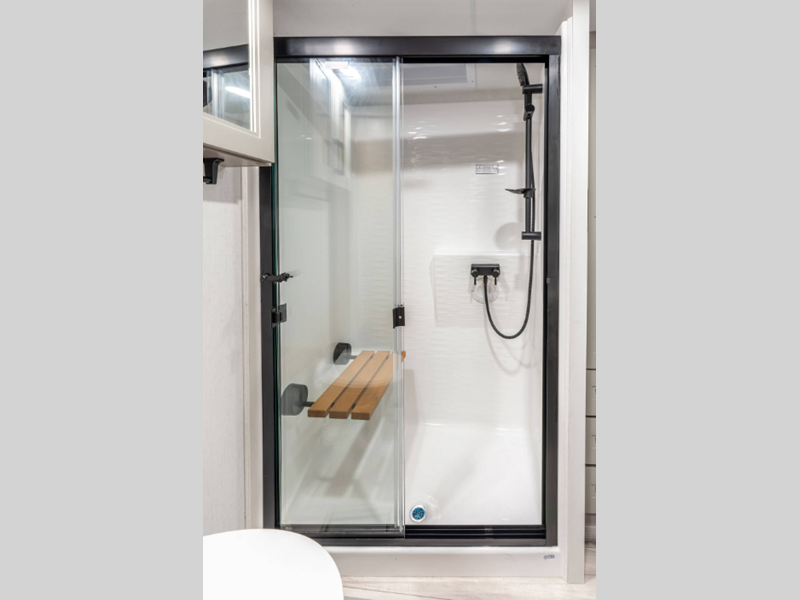 - Residential One-Piece Fiberglass Shower Stall w/Built-in Seat & Glass Doors