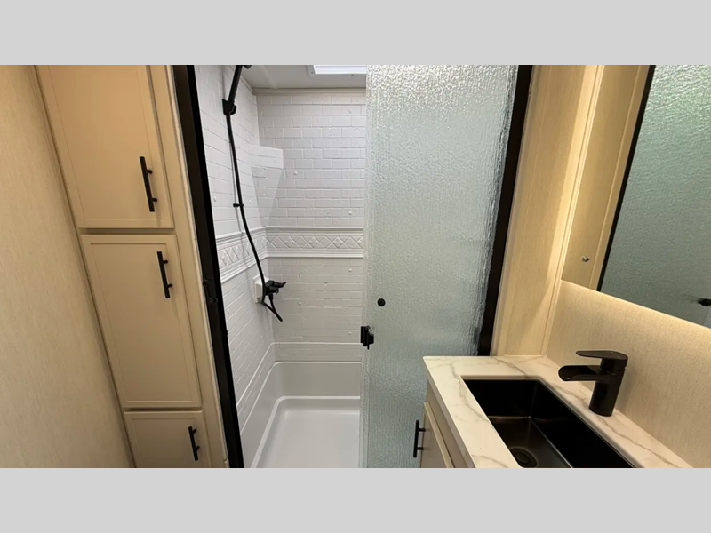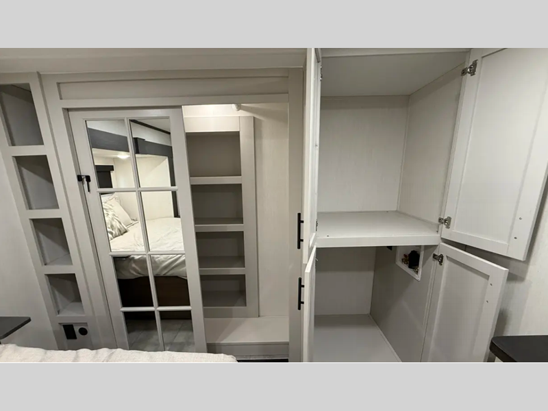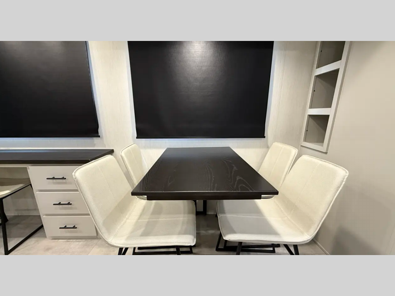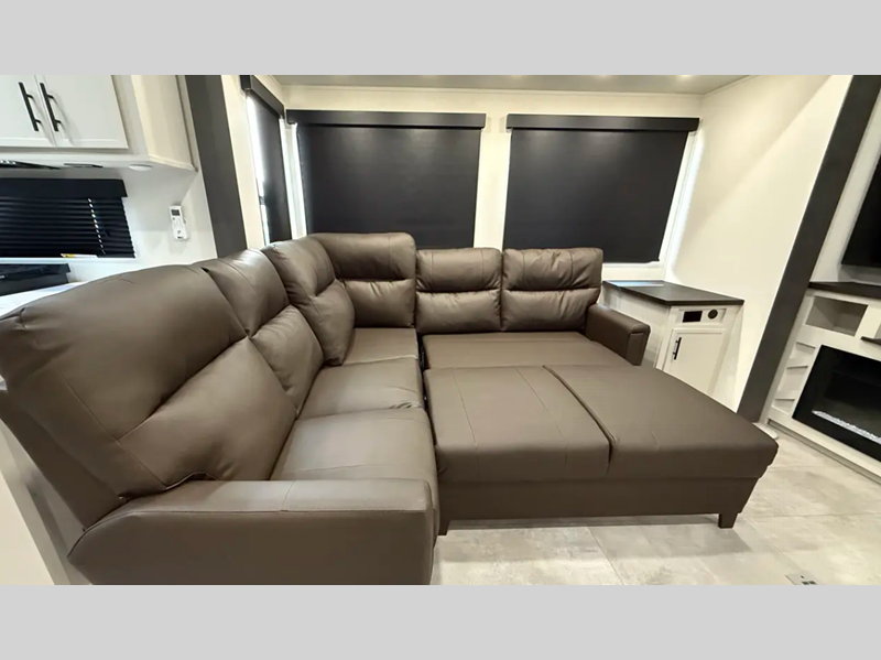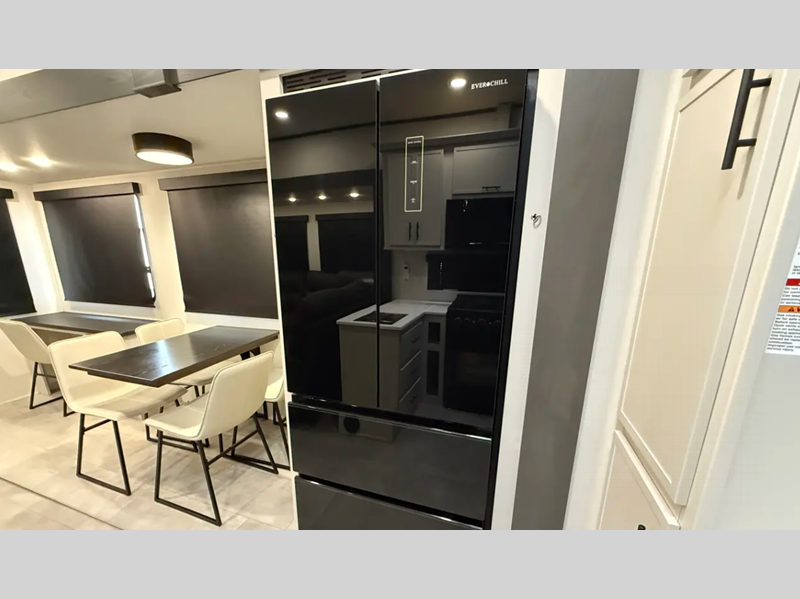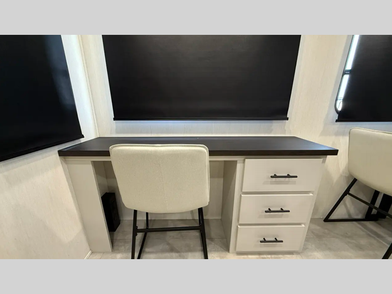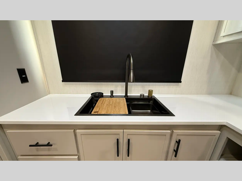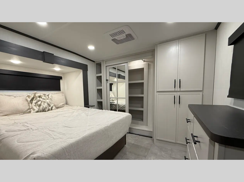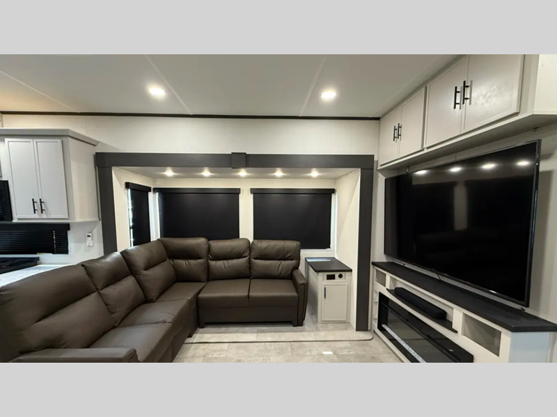 The durable Eternabond construction consists of 2" thick laminated slide boxes, a one-piece roof membrane, radiant foil insulation, and double wiper slide seals for added protection. There are Prime Time exclusive gold solar reflective windows outside, along with one-touch auto leveling, a labeled universal docking center, and more. And you're sure to feel right at home with real wood cabinet doors inside, plus blackout roller shades, soft close cabinetry, and an illuminated lighting package to name a few comforts.