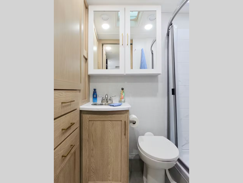 - Cab-Over Sleeping Area with Cup Holders, and Telescoping Bunk Ladder