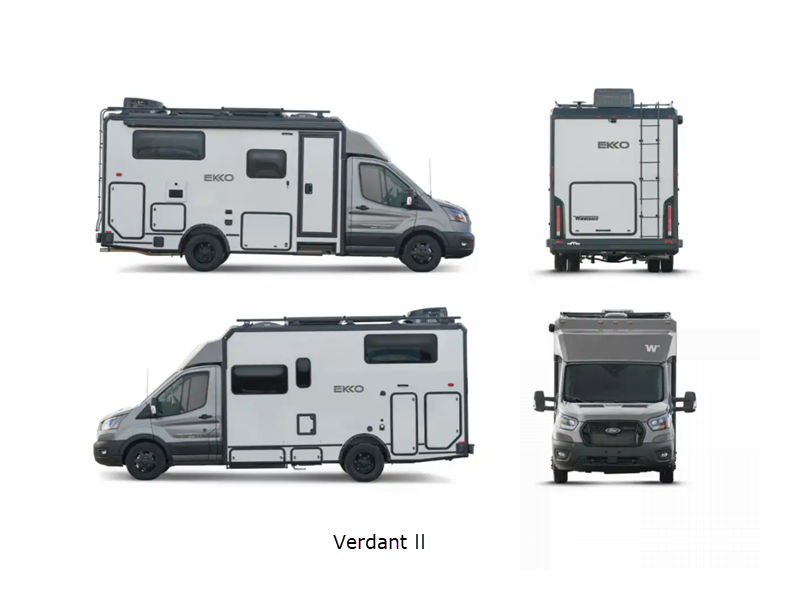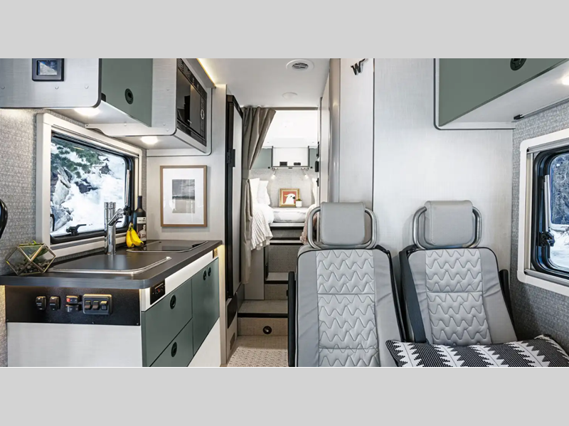 Sleeps 2 Length 23 ft Ext Width 7 ft 3 in Ext Height 10 ft 6 in Int Height 6 ft 8 in Interior Color Veredis, Juniper Exterior Color Raw Sienna ll, Raw Sienna ll with Graphics, Verdant ll, Verdant ll with Graphics Hitch Weight 5000 lbs GVWR 11000 lbs Fresh Water Capacity 50 gals Grey Water Capacity 51 gals Generator 2,800W Gas Fuel Type Gasoline Engine 3.5L EcoBoost V6 Chassis Ford AWD Transit Fuel Capacity 31 gals Wheelbase 156 in Available Beds Two Twin Refrigerator Type Single Door Compressor Driven 12V Refrigerator Size 5.3 cu ft Cooktop Burners 2 Shower Size 24" x 30" Number of Awnings 1 Axle Weight Front 4630 lbs Axle Weight Rear 7275 lbs LP Tank Capacity 40 lbs Water Heater Type Truma AquaGo Tankless Comfort Plus AC BTU 13500 btu Basement Storage 65.3 cu. ft. Awning Info 13' Power with LED Lighting and Bluetooth Control Gross Combined Weight 15000 lbs Shower Type Wet/Bath Shower Electrical Service 30 amp Similar Floorplans
