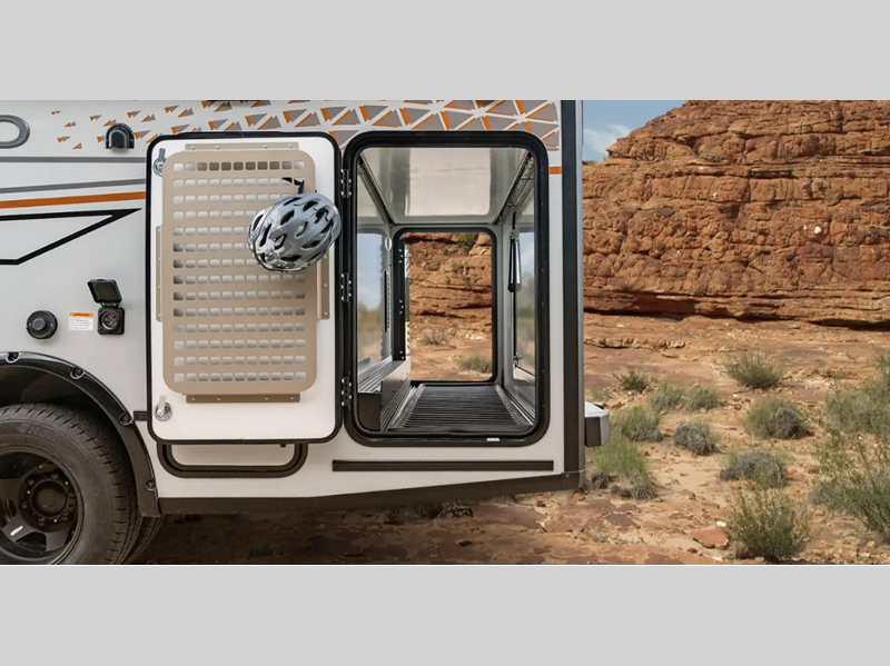 - Exterior kitchen w/chest style 12V refrigerator/freezer, 2-burner LP cooktop, flip-up counter extension, quick-connect faucet, collapsible sink, and LP quick-connect hose (N/A w/pop-top)