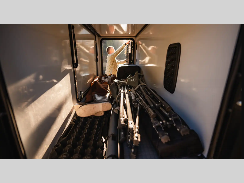 - Heated gear garage w/L-track cargo tie down system, removable floor liner, 110V/12V charging ports and LED lighting