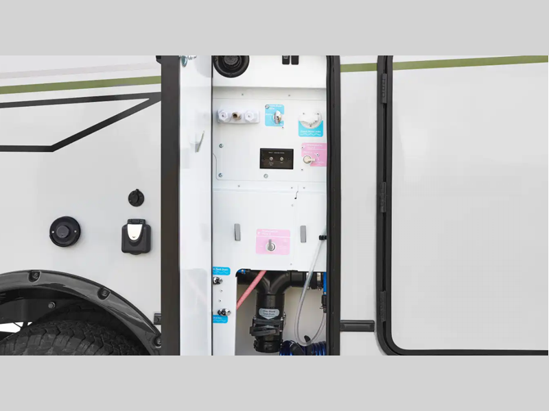 - Insulated water service center houses water center control panel, hooks, water pump switch, cable TV input, fresh water drain and portable satellite dish hook-up