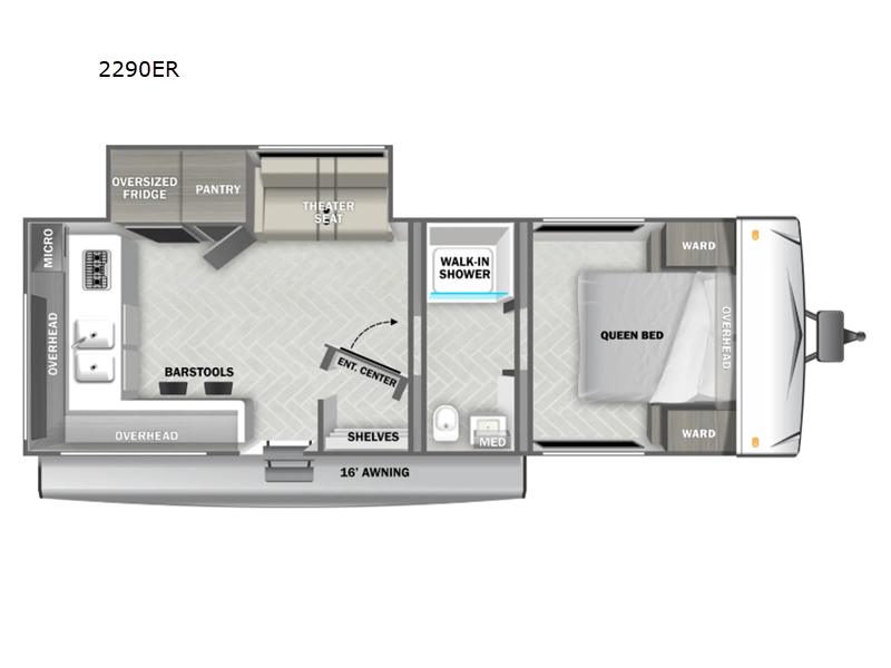 You'll love the amount of counter space you have in this rear kitchen travel trailer! You can whip up your best meals, then enjoy them at the counter with barstools. After dinner, you might want to relax on the theater seat within the large slide, or head outdoors to sit under the 16' power awning. There is a swiveling entertainment center with shelves behind it where you can keep books, games, or snacks stocked! The walk-thru bath leads you to the front master bedroom where you can get the best night of sleep on the queen bed!