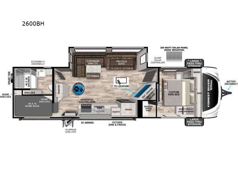 Are you looking to upgrade your RV to a trailer with more space and more features? Look no further than this Vibe! The kids are sure to claim the double-size bunks to themselves, while the adults take the front private bedroom with the queen bed. You will find even more sleeping space on the dinette and sleeper sofa within the large slide out. After a day outdoors at the lake, get cleaned up in the full bath that includes a 40" x 30" shower. There is so much more to love about this model, like the entertainment center, the oversized panoramic windows, and the large pass-through storage for all your gear!